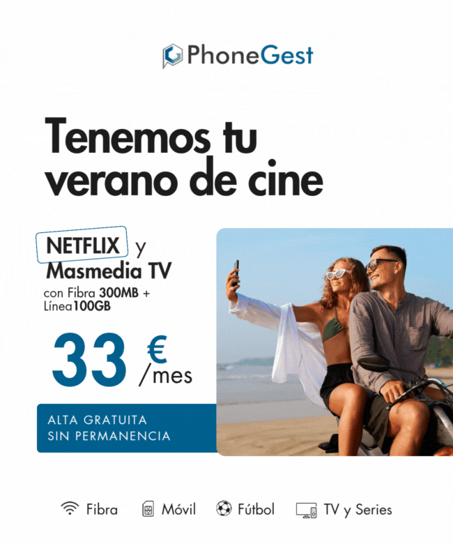 ¿Harto de pagar más por lo mismo? ¿Te subieron la tarifa? ¿Te prometieron atención y no contestan ni por WhatsApp? Eso con PhoneGest no te pasaría. Aprovecha la tarifa forocochera: 300mb de fibra + línea móvil 100GB + MASMEDIA TV + Netflix con anuncios por solo 33€/mes. ¡Y llamadas ilimitadas! Contacta con PhoneGest aquí.