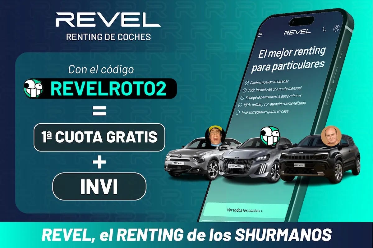 Todo el floro sabe que REVEL es el mejor RENTING de coches. Con el código REVELROTO2, tienes la PRIMERA CUOTA GRATIS en el coche que quieras de nuestra WEB. Además te regalamos una INVI porque sí, por ser forocochero. Puedes hacerte un REVEL en 5 minutos desde el móvil, SIN ENTRADA, pagando una cuota mensual con TODO INCLUIDO: seguro, impuestos, mantenimiento, asistencia en carretera, neumáticos, ITV... ¡Ah! Y te lo llevamos a casa mientras te echas una partida al Crash Bandicoot. ¡Hazte un REVEL, Shur!